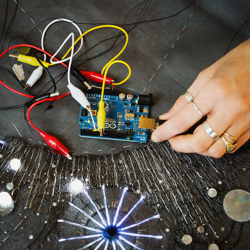 The silhouette is cosmic, entirely hand-embroidered and luminous. The motifs are inspired by the idea of the infinite; constellations, what is intangible and esoteric. Equipped with temperature sensors, this interactive dress uses the body's heat to have one's Aura come to life.